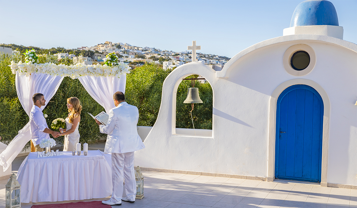 Miejsce ślubu Świętego Mikołaja to tradycyjny mały kościółek z niebieską kopułą na wiejskiej stronie Santorini z widokiem na wioskę Fira, winnice i Morze Egejskie ze wschodniej strony Santorini.