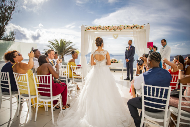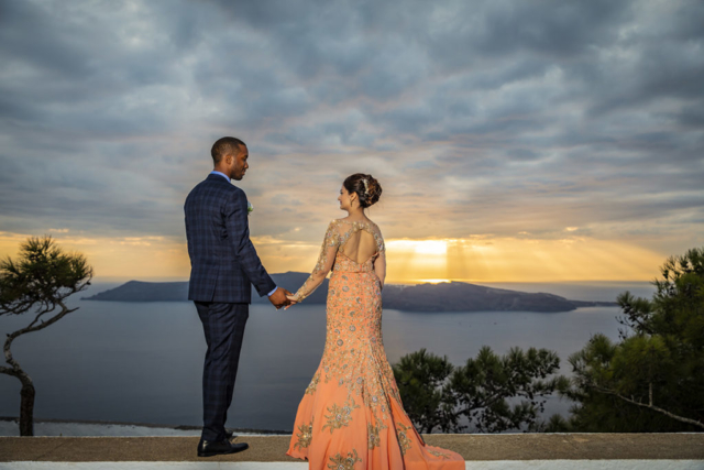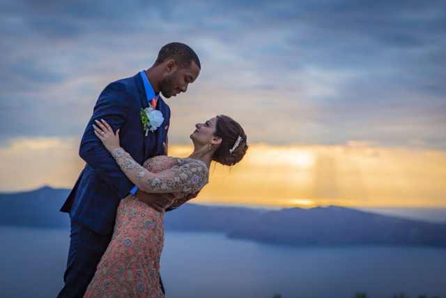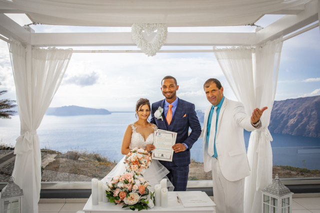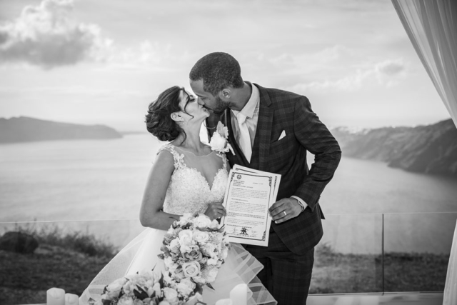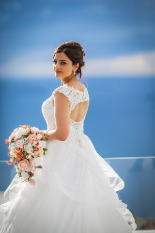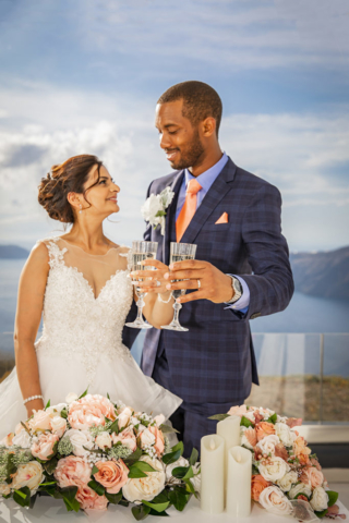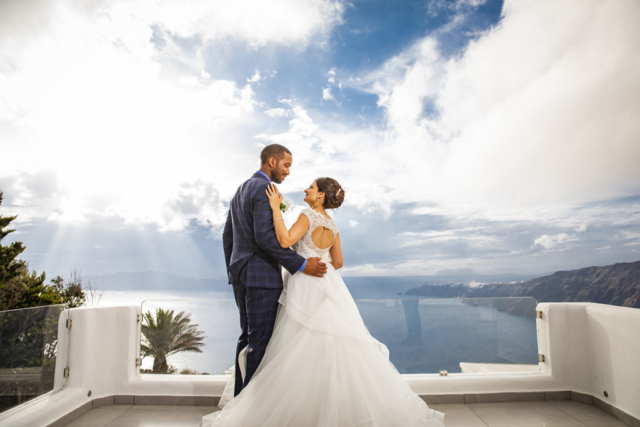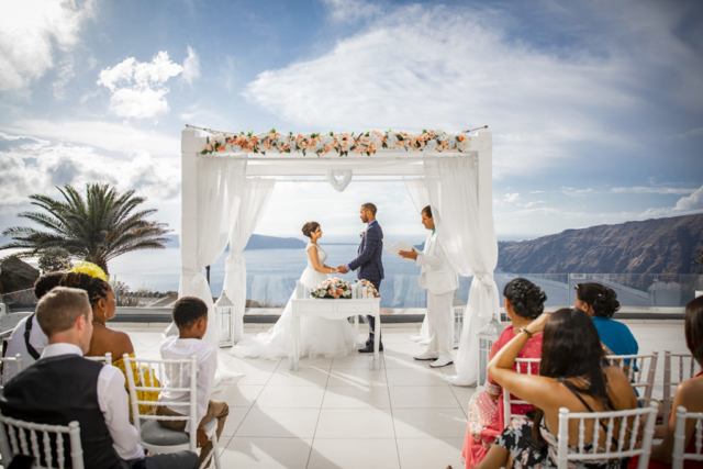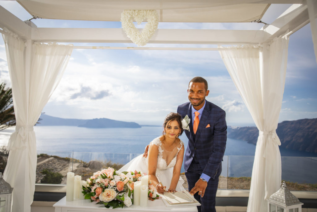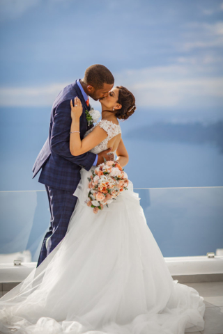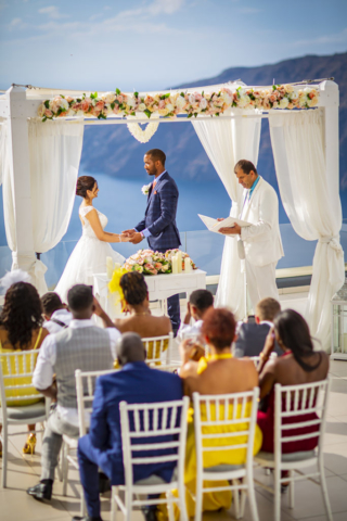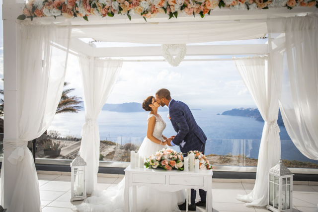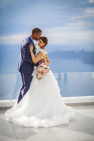 Your Wedding in Santorini needs the Perfect Wedding Venue. Le Ciel offers elegant indoor & outdoor spaces and a delicious choice of Wedding Menus. The Wedding Ceremony is held on our spectacular Caldera view terrace overlooking the Volcano and the Aegean Sea. The restaurant is spacious enough to host a wedding banquet but can be modified into an intimate candlelight dinner for two.